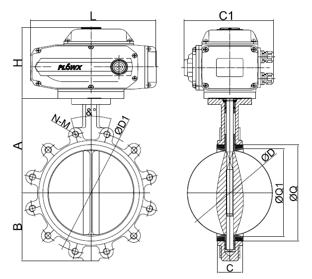 電動(dòng)支耳蝶閥尺寸圖: